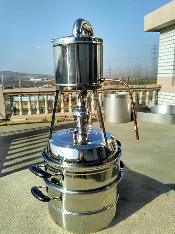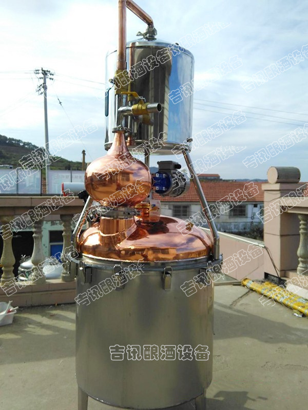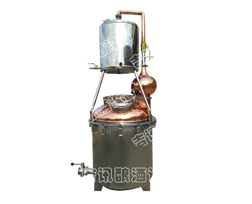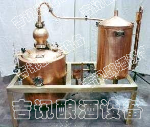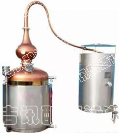 本機(jī)屬單次蒸餾機(jī)組,采用夏朗德蒸餾器與糧食酒蒸鍋部分優(yōu)勢(shì)特色,酒汽聚集在上方的球形回流器中,產(chǎn)生少量回流提餾,經(jīng)由延長(zhǎng)拔高蒸汽導(dǎo)管或天鵝之頸,使雜質(zhì)下沉與提餾,然后酒氣進(jìn)入冷卻器,在冷卻器中冷凝出粗酒,原酒三四十度左右。把一次 出的原酒重新加入蒸餾器進(jìn)行二次蒸餾,得到所需原酒,一般酒度為遞減過(guò)程?;蛘卟扇 扒芯啤狈绞饺【?蒸餾時(shí)的蒸汽,酒精濃度高,稱為“酒頭”,要和其他的分離,隨后獲得的是“酒心”,它是清澈透明的烈酒,取其酒心,然后低度酒混入發(fā)酵液或收集做二次蒸餾。